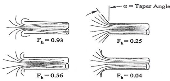 일반적으로 후드에서 덕트로 공기가 유입될 때 기류가 매우 불안정하여 덕트 초입부에서 난류가 크게 발생합니다. 따라서 후드의 유입계수(Coefficient of entry)는 테이퍼의 각도)에 따라 차이가 나타납니다.