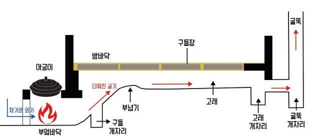 공기가 개자리에 오래 머물도록 하는 것이 불이 꺼진 후에도 구들이 장시간 온기를 유지하게 만드는 비결입니다.