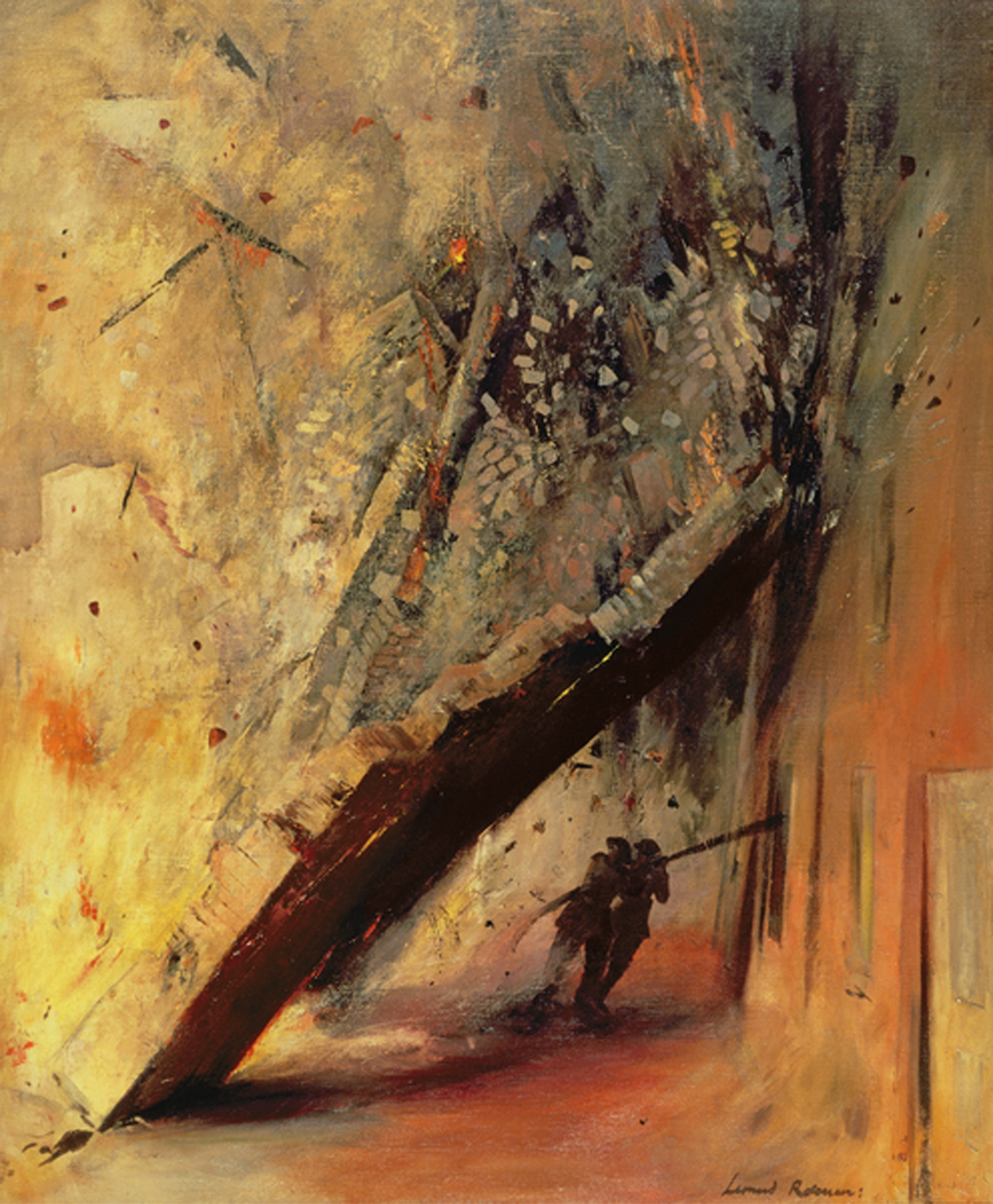 이 그림의 제목은 The Falling Wall로 알려져 있는데, 정식 명칙은 A House Collapsing on Two Firemen, Shoe Lane London, EC4 입니다. 2차 세계 당시 영국의 보조 소방관이었던 Leonard Henry Rosoman (1913~2012)이 그린 작품(1941)으로, 1940년 12월 29일 저녁에 시작된 Shoe Lane의 서적 창고(book warehouse)에서 발생한 화재에 대한 일화를 그린 것입니다.